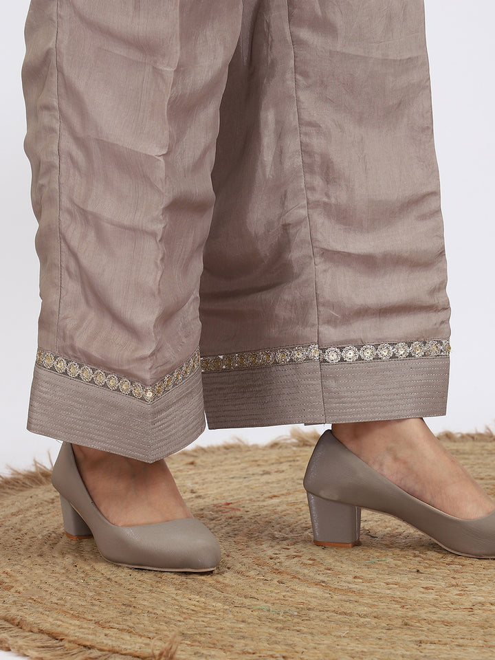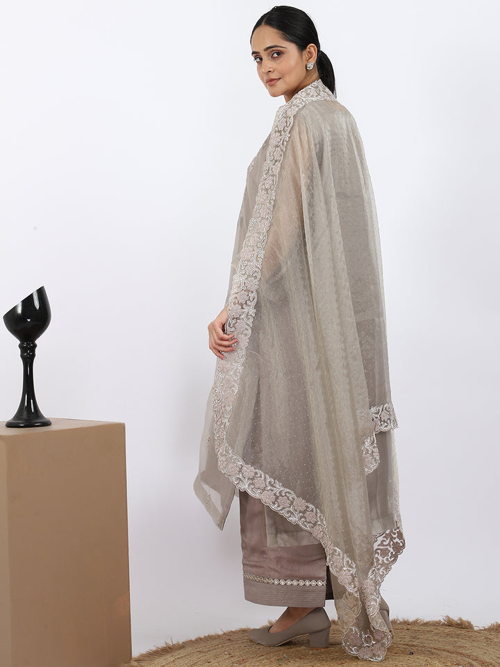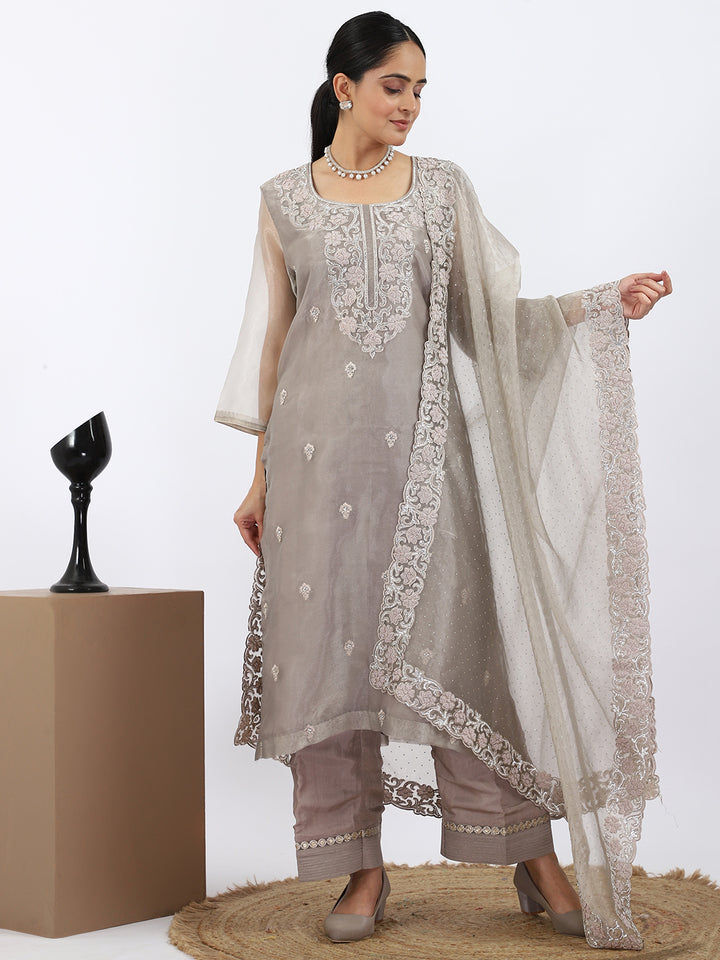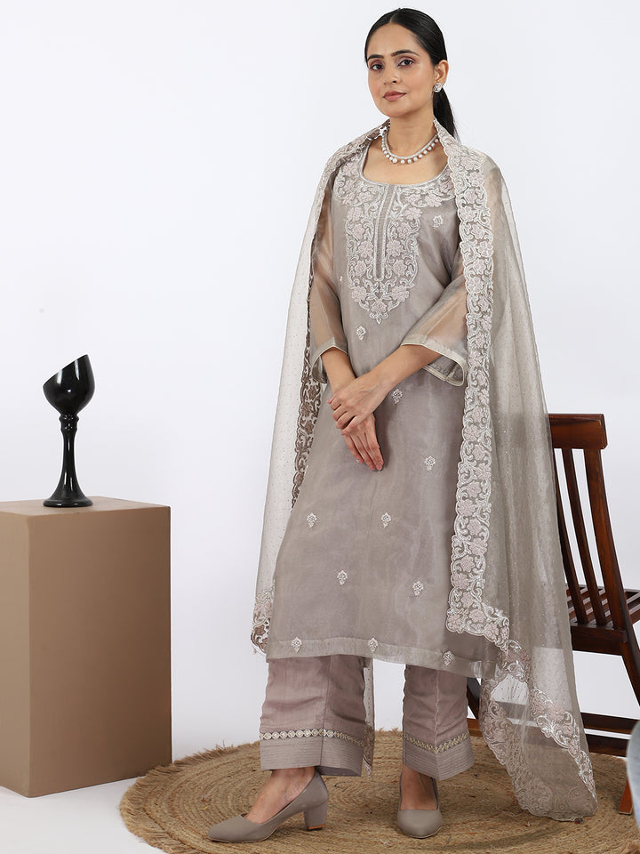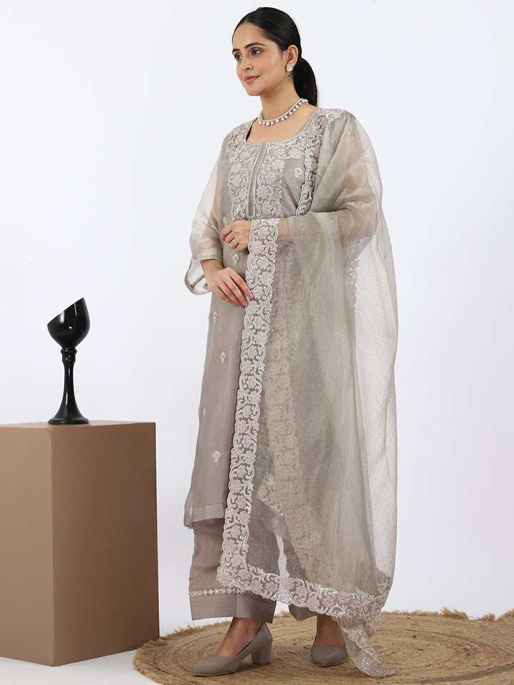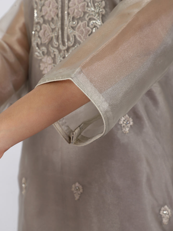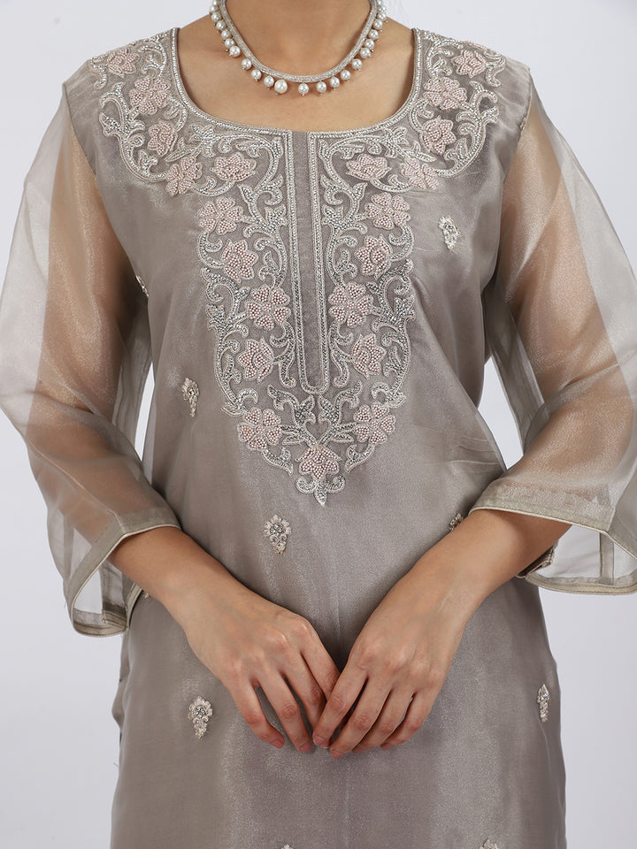 "Steel Serenity" Grey Organza Suit with Pearl & Swarovski Work